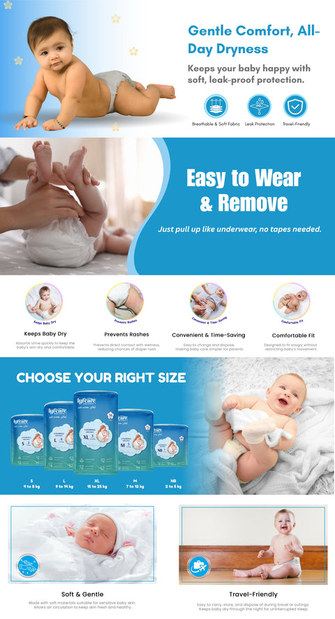 Lyfcare Baby Pants Style Diapers are designed to provide your baby with all-day comfort and long-lasting dryness. Additionally, these Baby Diapers feature soft, breathable fabric that feels gentle on delicate baby skin, while also supporting airflow to reduce irritation and discomfort.