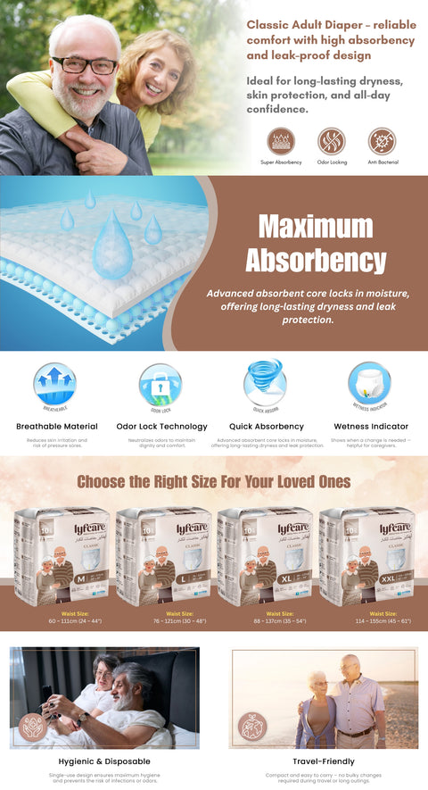 Lyfcare Classic Adult Diapers offer superior comfort, protection, and confidence for both men and women. Designed with advanced super absorption technology, these unisex diaper pants lock in moisture and keep your skin dry all day. The wetness indicator alerts you when it’s time for a change, ensuring hygiene and skin health. Enjoy 360° protection with a soft elastic waistband and snug leg cuffs that prevent leaks and provide a secure fit. Made from breathable, skin-friendly fabric, Lyfcare diapers minimize irritation and allow airflow for all-day freshness. The pull-up pants style ensures a discreet and comfortable fit, perfect for active lifestyles and daily wear. Whether at home or on the go, Lyfcare Adult Diapers deliver reliable protection, long-lasting comfort, and complete peace of mind
