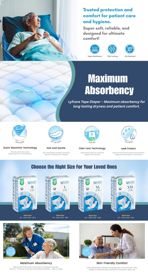 Lyfcare Adult Diapers are designed for superior absorption, odor control, and leakproof comfort — trusted by healthcare professionals and