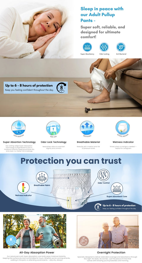 Lyfcare Adult Diapers are designed for ultimate comfort and all-day protection. Suitable for both men and women, these unisex pant-style diapers feature a built-in wetness indicator that signals when it’s time for a change. The advanced super absorption layer locks in moisture, keeping your skin dry and irritation-free. With 360° protection and zero leakage, the elastic waistband and leg cuffs ensure a snug, secure fit for worry-free movement. Made from soft, breathable fabric, these diapers allow proper air circulation, preventing rashes and maintaining skin health. The discreet pull-up design fits comfortably under clothing, offering confidence and freedom for active lifestyles. Ideal for adults seeking dependable hygiene care, Lyfcare Adult Diapers combine comfort, protection, and convenience in every wear.