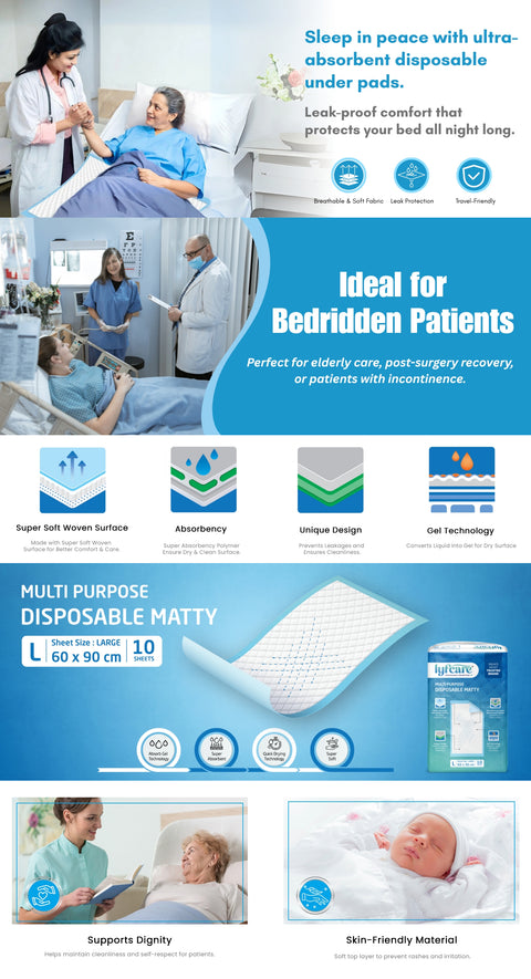 LyfCare Disposable Underpads are designed to provide reliable protection and superior comfort for adults with incontinence, post-maternity, or post-surgery needs. Made from ultra-soft, non-woven fabric, they feel gentle on the skin while ensuring quick absorption and dryness throughout the night. The waterproof backing prevents leakage and keeps beds, chairs, and other surfaces clean and hygienic. These large 60x90 cm underpads offer wide coverage and stay securely in place, giving users confidence and peace of mind. Ideal for hospitals, elderly care, travel, and home use, LyfCare Underpads combine comfort, hygiene, and convenience in every sheet. Choose LyfCare for trusted hygiene care and all-day freshness.